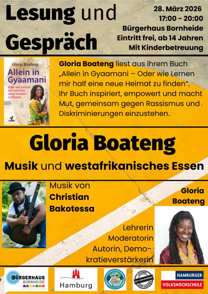 Im Rahmen der Internationalen Wochen gegen Rassismus 2026 lädt das Bürgerhaus Bornheide zu einer besonderen Lesung ein mit Musik, Gesprächen und westafrikanischem Essen. Gloria Boateng kommt an den Osdorfer Born und liest aus ihrem Buch „Allein in Gyaamani – Oder wie Lernen mir half eine neue Heimat zu finden“. Ihr Buch inspiriert, empowert und macht Mut, gemeinsam gegen Rassismus und Diskriminierungen einzustehen.