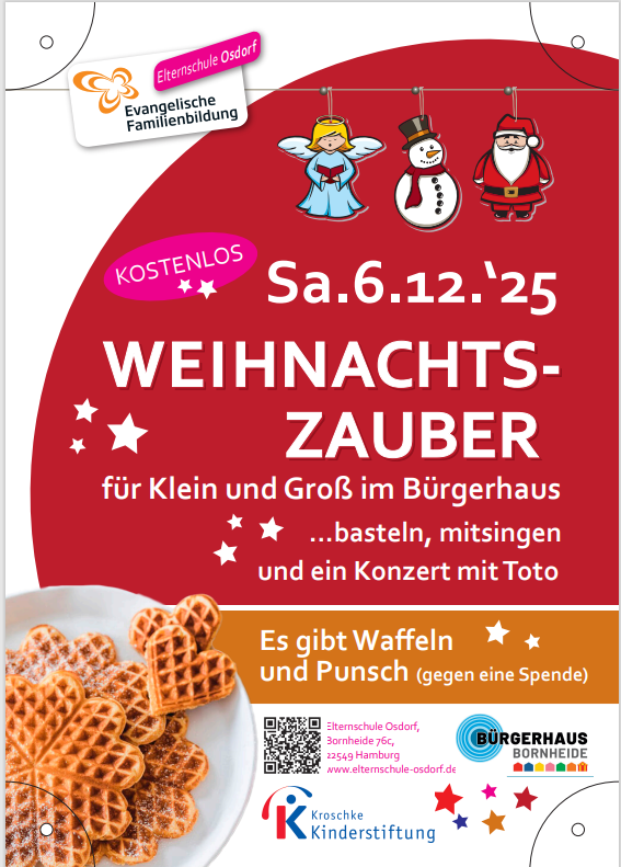 Elternschule Osdorf / Evangelische FamilienbildungAm Samstag, den 6.12. findet von 11- 13.30 Uhr im Bürgerhaus Bornheide der Weihnachtszauber für Groß und Klein statt. Es wird gebastelt und gesungen. Toto gibt ein Konzert. Die Veranstaltung ist kostenlos. Punsch und Waffeln gibt es gegen eine Spende.