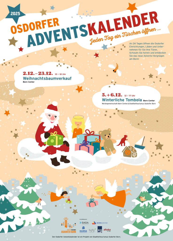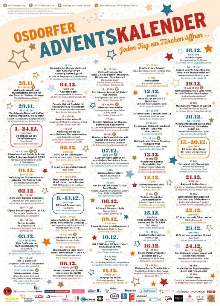 Auch in diesem Jahr gibt es wieder den beliebten Osdorfer Adventskalender vom Stadtteiltourismus Osdorfer Born und das Bürgerhaus Bornheide ist mit einigen Veranstaltungen dabei. Vom 1. bis 24. Dezember gibt es jeden Tag ein Türchen zu öffnen. Dahinter verstecken sich Musik- und Theaterveranstaltungen, Bastel- und Backaktionen, Informationsveranstaltungen sowie kleine Präsente für Jung und Alt. Die Aktionen finden im Born Center, den Institutionen im Bürgerhaus, im KL!CK Kindermuseum, in den Kirchen, in den Schulen und Wohnungsunternehmen sowie an weiteren Orten im Stadtteil statt. Alle teilnehmenden Orte sind durch große Zahlen in den Fenstern sichtbar gemacht. Seid dabei! Hier sind die Aktionen für dieses Jahr: